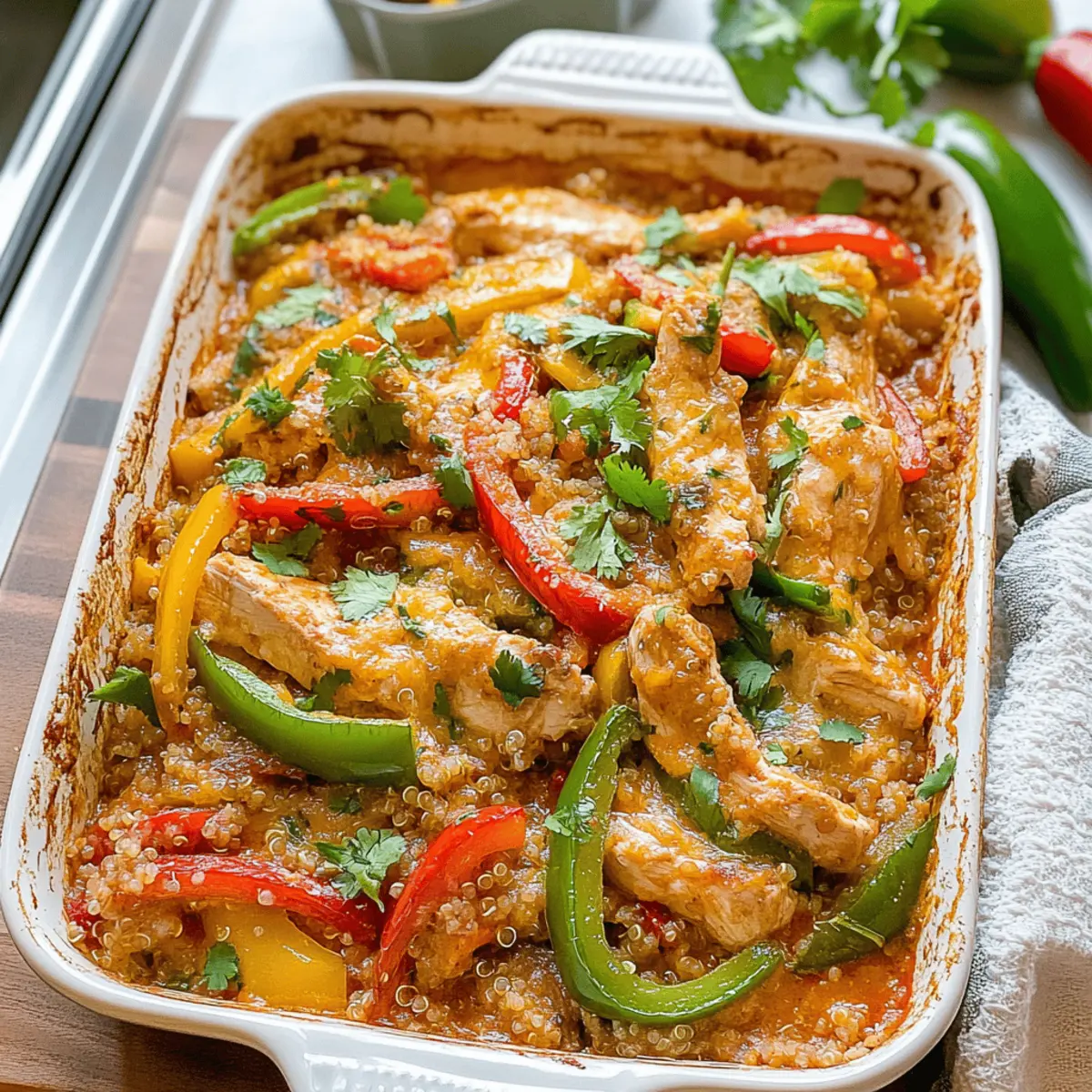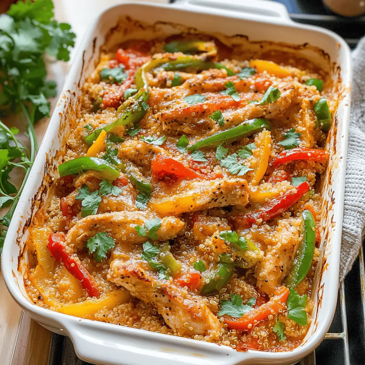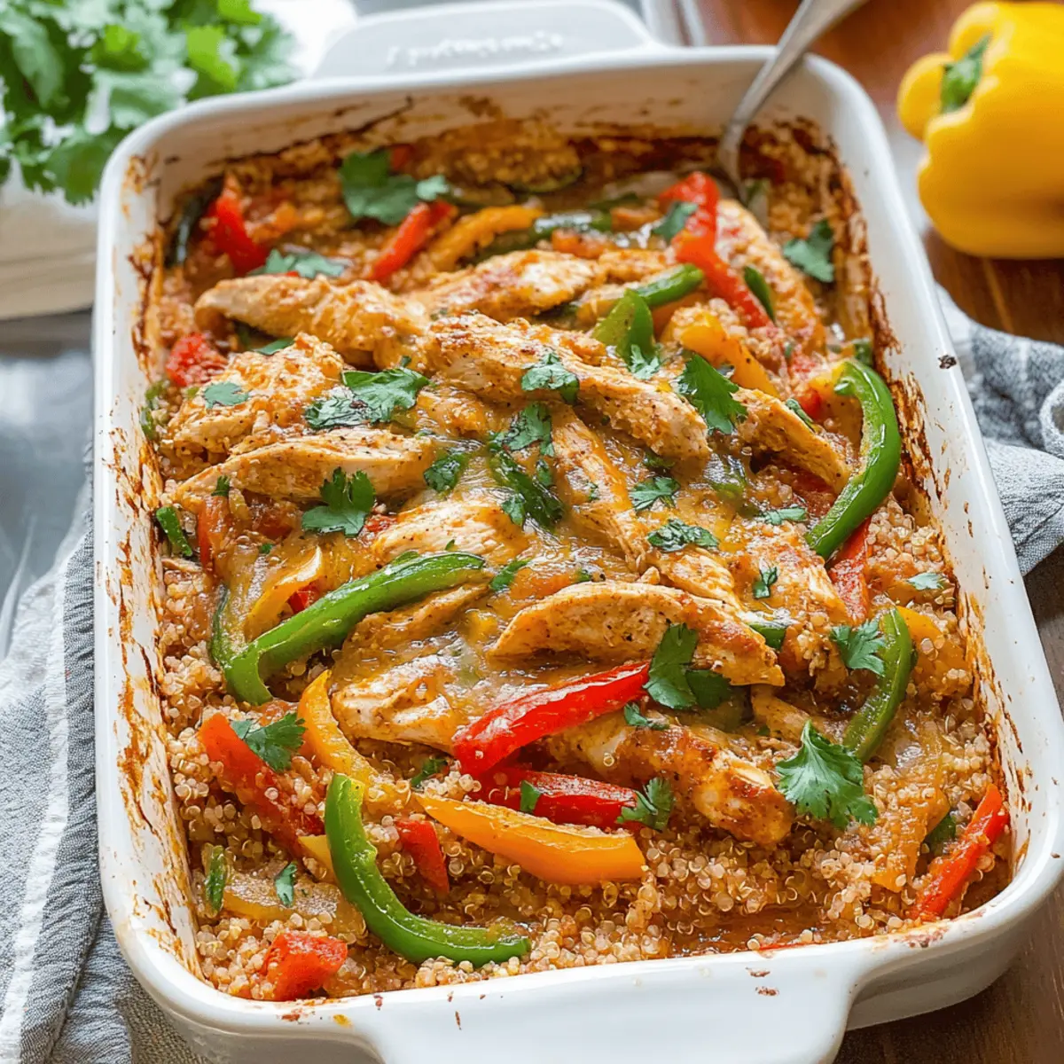 The aroma of sizzling peppers and spices wafting through the kitchen takes me back to my first Mexican fiesta, and it ignited a passion for bold flavors that never fades. Today, I’m thrilled to share my Mexican Chicken Fajita Casserole—a vibrant, gluten-free dish that turns the lively essence of traditional fajitas into an easy, one-pan meal. It’s not just delectable; this recipe is a time-saver that’s perfect for busy weeknights, combining wholesome ingredients like lean chicken, protein-packed black beans, and nutrient-rich quinoa. No need for pre-cooking—just toss everything together and let the oven work its magic. Ready for a colorful, comforting dish that your family will love? Let’s dive into this deliciously simple casserole! Why Make Mexican Chicken Fajita Casserole? Delightfully Easy: With minimal prep and no pre-cooking, this casserole is perfect for any home cook who values simplicity. Bursting with Flavor: Each bite is a fiesta of taste, thanks to the vibrant spices and fresh vegetables. Gluten-Free Goodness: Enjoy a comforting dish that accommodates gluten-free diets, made with wholesome, nutritious ingredients. Meal Prep Marvel: Make it ahead of time and store it for effortless weeknight dinners, just like Pesto Chicken Pasta. Crowd-Pleasing Appeal: A family favorite that promises deliciousness in every single serving, making mealtime a celebration! Mexican Chicken Fajita Casserole Ingredients For the Base Salsa – Provides moisture and flavor base for the casserole; use any thick and chunky variety for the best taste. Black Beans – Adds protein and fiber; rinse and drain before use for optimal flavor and texture. Chicken Broth – Enhances depth and moisture; choose reduced-sodium for a lighter, healthier option. Quinoa – A gluten-free grain base that absorbs flavors and liquid during baking; rinse if not pre-rinsed for best results. For the Vegetables Red Bell Pepper – Adds sweetness and crunch; substitute with yellow or orange for a sweeter profile. Green Bell Pepper – Provides a slight tartness; any color of bell pepper can be used based on your preference. Sweet Onion – Contributes flavor and sweetness; can swap for yellow or red onion based on taste preference. For the Protein Boneless Skinless Chicken – The main protein source; use chicken breasts or tenders, cut into thin strips for quicker cooking. For Seasoning Olive Oil – Coats the chicken and veggies for better flavor distribution; essential for a well-balanced dish. Chili Powder – Adds warmth and spice for that authentic fajita taste. Ground Cumin – Introduces a smoky depth of flavor that perfectly complements the dish. Garlic Powder – Enhances overall taste, adding a savory note. Kosher Salt – Essential for balancing and bringing out the flavors of the dish. Embrace the mouthwatering flavors of this Mexican Chicken Fajita Casserole, and create a wholesome meal that delights everyone at the table! Step‑by‑Step Instructions for Mexican Chicken Fajita Casserole Step 1: Preheat the Oven Begin by preheating your oven to 400°F (200°C). This is an important step to ensure that your Mexican Chicken Fajita Casserole cooks evenly and thoroughly. While the oven is warming up, gather your ingredients and equipment, including a 9×13-inch baking dish for the assembly. Step 2: Prepare the Base In the prepared baking dish, combine your salsa, rinsed black beans, chicken broth, and uncooked quinoa. Stir the mixture until it’s evenly distributed, allowing the salsa to coat the quinoa and beans well. This flavorful base is essential for creating the delicious blend of textures and tastes in your casserole. Step 3: Mix the Chicken and Vegetables In a large mixing bowl, toss together the sliced red and green bell peppers, sweet onion, chicken strips, olive oil, chili powder, ground cumin, garlic powder, and kosher salt. Mix until everything is well coated with the oil and spices, enhancing the flavor profile of your Mexican Chicken Fajita Casserole. Step 4: Assemble the Casserole Spoon the seasoned chicken and vegetable mixture evenly over the quinoa blend in the baking dish. It’s vital to spread the ingredients out so that they cook uniformly. The vibrant colors of the peppers and onions will create an inviting look, making it hard to resist this wholesome dish. Step 5: Bake and Cover Cover the baking dish tightly with aluminum foil to retain moisture during baking. Place it in the preheated oven and bake for 40 to 50 minutes. You’ll know it’s ready when the chicken is cooked through and the quinoa is tender, absorbing all the wonderful flavors of the casserole. Step 6: Serve and Enjoy Once cooked, carefully remove the foil and let the casserole cool for a few minutes. Serve your Mexican Chicken Fajita Casserole hot, topped with optional garnishes such as shredded cheese, fresh lettuce, sour cream, or guacamole for added flavor and freshness. Enjoy the hearty ingredients and mouthwatering aroma! How to Store and Freeze Mexican Chicken Fajita Casserole Fridge: Store the casserole tightly covered in the fridge for up to 3 days. It’s perfect for reheating leftovers on those busy nights! Freezer: You can freeze leftover portions in an airtight container for up to 3 months. Thaw in the fridge overnight before reheating for best results. Reheating: To reheat, warm in the microwave or oven until heated through, about 20-25 minutes at 350°F, ensuring the chicken in your Mexican Chicken Fajita Casserole doesn’t dry out. Make-Ahead: Assemble the casserole in advance, cover, and refrigerate. Just pop it in the oven when you’re ready to enjoy! What to Serve with Mexican Chicken Fajita Casserole The beauty of a flavorful casserole like this is how easily it pairs with delightful sides that enhance your dining experience. Creamy Avocado Salad: This fresh, creamy salad with ripe avocados and cherry tomatoes complements the casserole’s savory flavors while adding a refreshing crunch. Sp